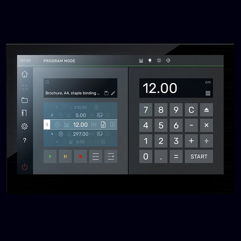 A large 15.6-inch multi-touch display features intuitive, swipe-based software with a clear main screen and intelligently split layout for efficient operation. The tilt-adjustable display allows users to customize viewing angles to suit body height and lighting conditions, improving comfort during extended use. Precision is enhanced through manual fine adjustment of the backgauge, controlled via an ergonomic adjustment element for exact positioning.
